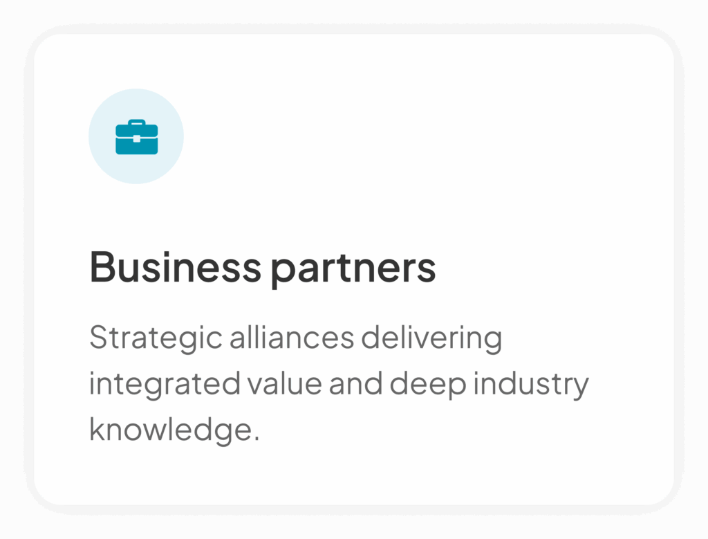 Our partners contribute deep industry knowledge and complementary services, creating a richer ecosystem that ensures our solutions address all your needs, offering integrated approaches and validated expertise you can depend on.
